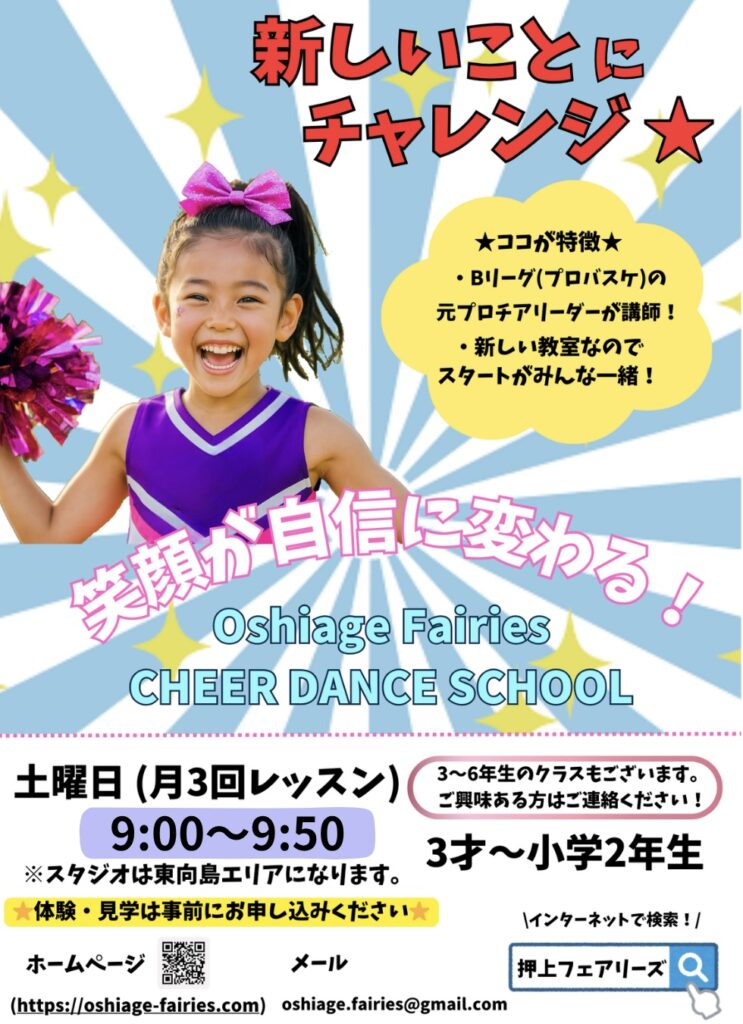 フェアリーズ チアダンススクール子供の自信と笑顔を育む! チアダンス教室初心者歓迎!体験レッスンはこちら 新規生徒大募集!! 今なら体験レッスンに参加すると 入会金4000円が0円! 〜随時募集中〜お気軽にお問い合わせください 浅草にチアダンス教室がオープン! 浅草フェアリーズの詳細はこちらから 3つの魅力ポイント 初めてのお子様でも安心!初めてのお子様でも一から丁寧に指導します。みんなと一緒に踊る過程で成長を優しくサポートします。 プロフェッショナルな指導!現役のチアリーダーによるプロフェッショナルな指導で、楽しみながら本格的なチアダンスを学べます。 発表の場を多数企画!押上フェアリーズでは、子どもたちが自信を持ってステージに立てるよう、様々な発表の場を企画しています。 曳舟駅から徒歩5分!墨田区東向島にある施設の3階フロアを貸し切ってレッスンを行います!駅からの道のりも簡単でわかりやすいです。40人が入れる広いスペースなので、周りに気を遣うことなく思いっきり楽しく踊れます!施設の詳細はこちら 申し込みまでの3ステップ STEP01体験レッスンに申し込もう!ダイレクトメールもしくはウェブサイトから簡単に無料体験レッスンの申し込みができます。 STEP02体験レッスンに参加!開催される日に教室に来て、楽しいチアダンスのレッスンを体験してみよう。入会金無料の機会をお見逃しなく! STEP03入会手続きをしよう!体験レッスンの後、入会を希望される方は、簡単な手続きを行って入会完了!これで楽しいチアダンスの仲間入りです。 まずは体験してみよう!興味のある方は下のボタンをクリック!体験レッスン参加 講師紹介 元Bリーグチアリーダーとして活動!クラシックバレエと舞台経験豊富なSAKIが直接丁寧に指導します。楽しくエネルギッシュに一緒に踊りましょう!もっと読む 今すぐご連絡を!押上フェアリーズの素敵なチアダンスレッスンで子供たちの可能性を拡げましょう。お気軽にお問い合わせください。体験レッスン参加 一般社団法人日本チアダンス協会