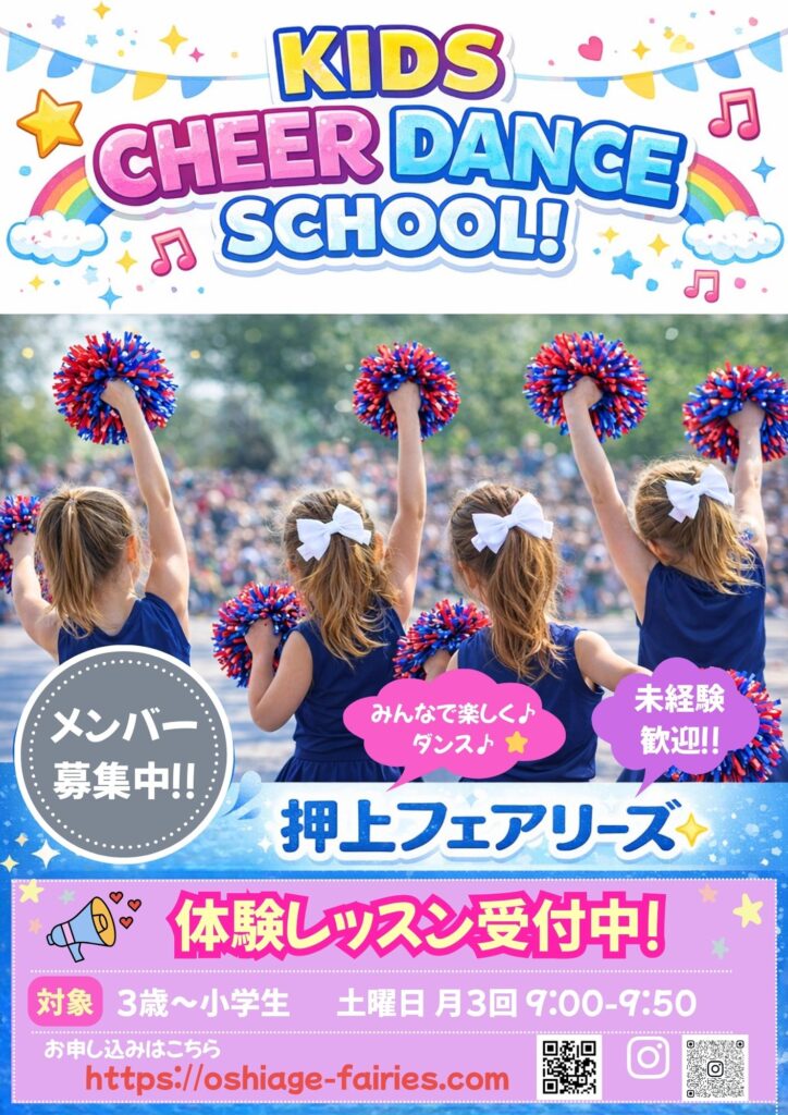 フェアリーズ チアダンススクール子供の自信と笑顔を育む! チアダンス教室初心者歓迎!体験レッスンはこちら 体験レッスン開催中!! 今なら体験レッスンに参加すると 入会金4000円が0円! 〜随時募集中〜お気軽にお問い合わせください 浅草にチアダンス教室がオープン! 浅草フェアリーズの詳細はこちらから 3つの魅力ポイント 初めてのお子様でも安心!初めてのお子様でも一から丁寧に指導します。みんなと一緒に踊る過程で成長を優しくサポートします。 プロフェッショナルな指導!元プロチアリーダーによるプロフェッショナルな指導で、楽しみながら本格的なチアダンスを学べます。 発表の場を多数企画!フェアリーズチアダンスでは、子どもたちが自信を持ってステージに立てるよう、様々な発表の場を企画しています。 曳舟駅から徒歩5分!墨田区東向島にある施設の3階フロアを貸し切ってレッスンを行います!駅からの道のりも簡単でわかりやすいです。40人が入れる広いスペースなので、周りに気を遣うことなく思いっきり楽しく踊れます!施設の詳細はこちら 申し込みまでの3ステップ STEP01体験レッスンに申し込もう!ダイレクトメールもしくはウェブサイトから簡単に無料体験レッスンの申し込みができます。 STEP02体験レッスンに参加!開催される日に教室に来て、楽しいチアダンスのレッスンを体験してみよう。入会金無料の機会をお見逃しなく! STEP03入会手続きをしよう!体験レッスンの後、入会を希望される方は、簡単な手続きを行って入会完了!これで楽しいチアダンスの仲間入りです。 まずは体験してみよう!興味のある方は下のボタンをクリック!体験レッスン参加 講師紹介 元Bリーグチアリーダーとして活動!クラシックバレエと舞台経験豊富なSAKIが直接丁寧に指導します。楽しくエネルギッシュに一緒に踊りましょう!もっと読む 今すぐご連絡を!フェアリーズチアダンスの素敵なチアダンスレッスンで子供たちの可能性を拡げましょう。お気軽にお問い合わせください。体験レッスン参加 一般社団法人日本チアダンス協会
